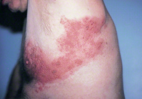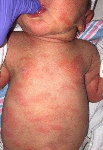 A 4-day-old male newborn is brought to the office by his parents because of a 2-day history of a rash on his face and trunk. He was delivered at 40 weeks’ gestation and weighed 5015 g (11 lb 1 oz) at birth. Apgar scores were 9 and 10 at 1 and 5 minutes, respectively. He has been breast-feeding well and passes normal stools. Vital signs are within normal limits, including temperature of 37.0°C (98.6°F). Physical examination discloses the findings shown in the photograph. Which of the following is the most likely cause of the findings in this patient?