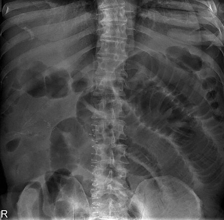 Abdominal x-ray is shown. Which of the following is the most likely underlying cause of the findings in this patient?