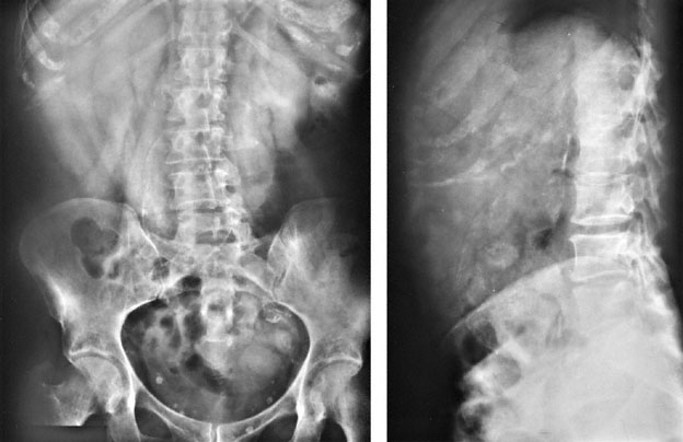 A 3-year-old girl is brought to the clinic by her mother after the mother noticed a firm mass in the child’s abdomen while bathing her today. The patient’s medical history is remarkable for cerebral palsy with feeding dysfunction. Medications are baclofen and levetiracetam. She uses a wheelchair for mobility and is fed through a gastrostomy tube. For the past 2 weeks, she has had decreased stool volume with small liquid bowel movements. She has not had vomiting or feeding intolerance. She is at the 25th percentile for height and the 5th percentile for weight; BMI is at the 3rd percentile. Vital signs are normal. The patient appears alert and happy. Abdomen is distended and a large, firm mass is palpated in the left lower quadrant. Muscle tone is increased throughout all extremities and there is clonus in both ankles. The remainder of the physical examination discloses no abnormalities. Which of the following is the most appropriate next step in evaluation?