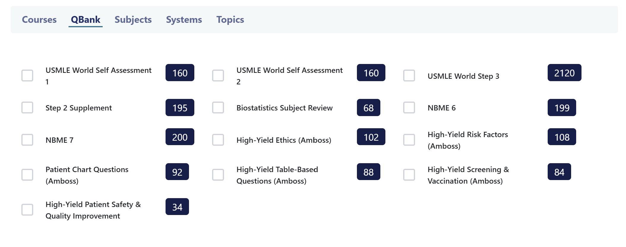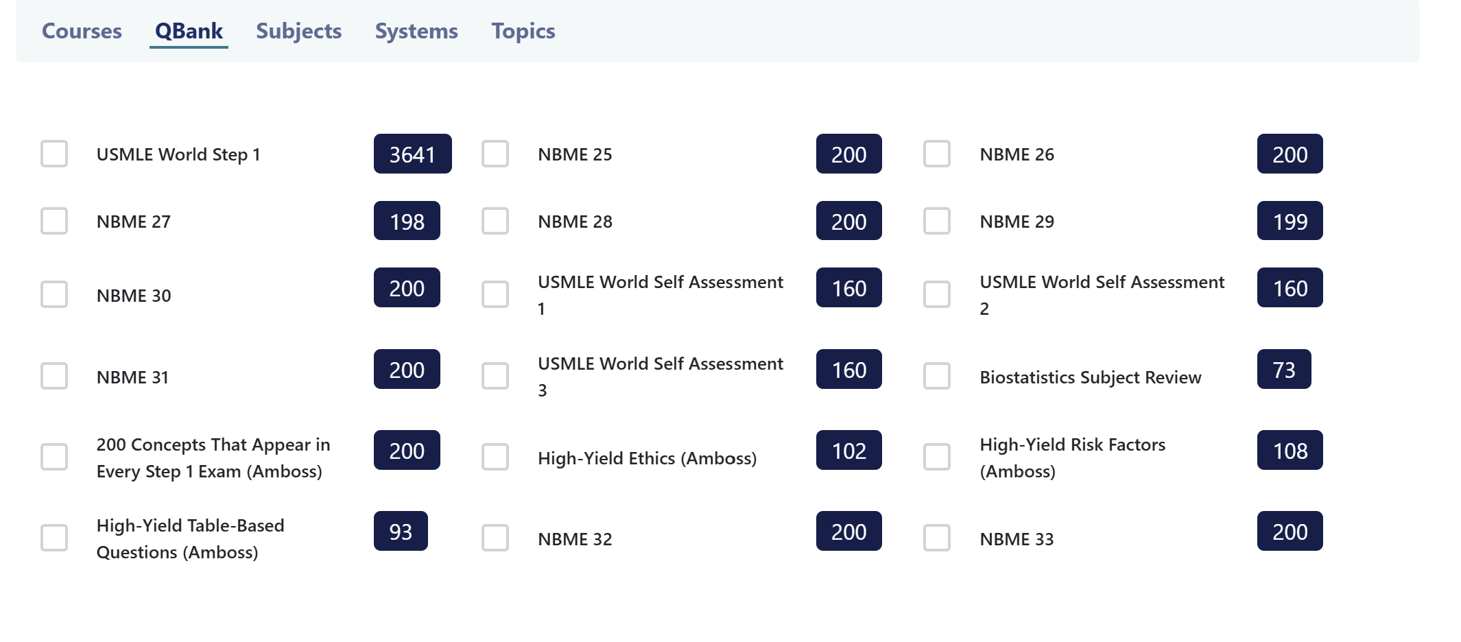 With your subscription, you’ll never need another question bank again. Our Qbank combines the best of all major USMLE resources for Step 1, Step 2 CK, and Step 3 - and yes, even self‑assessments are included.